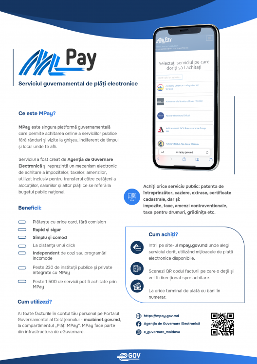Platforma de plăți electronice mpay.gov.md este serviciul guvernamental de plăți electronice, un instrument informațional cu ajutorul căruia pot fi achitate diverse servicii online. Deși MPay țintește în primul rând către serviciile electronice din sectorul public, el poate fi utilizat cu succes și pentru serviciile comerciale.